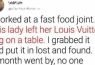 One day, while working at a fast food restaurant, I noticed a lady had left her Louis Vuitton bag on a table. After waiting 20 minutes and realizing she wasn’t coming back, I decided to take the bag to the lost and found. I didn’t look inside, just placed it there and went back to work.
